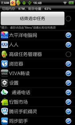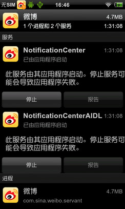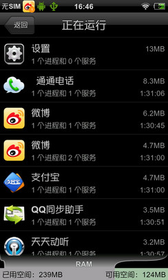 已用应用程序/进程结束 Android手机在设置菜单中内置了应用管理程序,点击进入可以看到正在运行的应用程序以及所占内存,在这里我们也可以对不需要的进程进行强行停止,这样可有有效地释放部分内存,缺点就是只能一个一个进行操作。