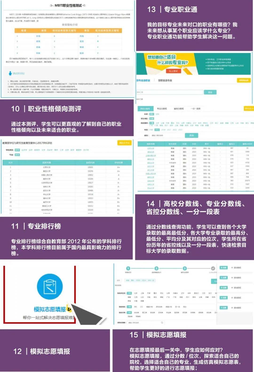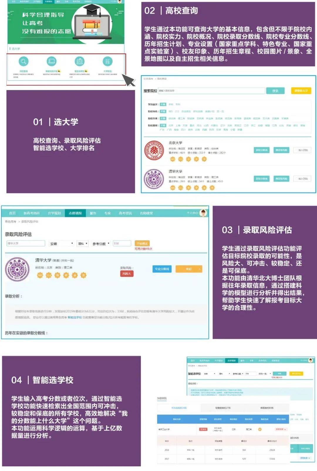 校依托北京大学、清华大学、北京师范大学等团队的高科技实力,开发出逻辑严密、算法精准、科学合理的智能志愿填报系统,以上亿级数据为基础,为学生提供精准、科学的全程志愿指导服务。