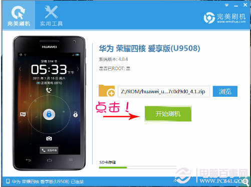 刷机步骤三:刷机开始 将Rom添加到选项框之后点击“开始刷机”,软件进入智能刷机模式,你的华为荣耀2开始享受刷机服务。这是最关键的华为U9508刷机步骤,刷机软件运行需要5—10分钟,在这段时间预测(数据为往年仅供参考)里你需要做的仅仅是耐心等待,不要对手机进行任何额外操作,比如移动和触碰!