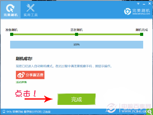 刷机步骤四:刷机成功 当刷机软件此时页面如下图所示,表示这是华为荣耀2四核U9508刷机教程***一个步骤,刷机软件已经为华为U9508完成刷机工作,请点击“完成”。 点击“完成”后同样不要移动手机,华为U9508自动重启才标志刷机过程正式结束,这个过程要持续3-5分钟,耐心等待!