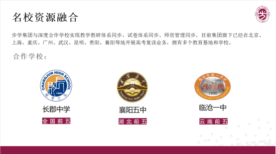 步学集团与深度合作学校实现教学教研体系同步、试卷体系同步、师资管理同步,目前集团旗下已经在北京、上海、重庆、广州、武汉、昆明、贵阳、襄阳等地开展高考复读相关业务,拥有多个教育基地和学校。