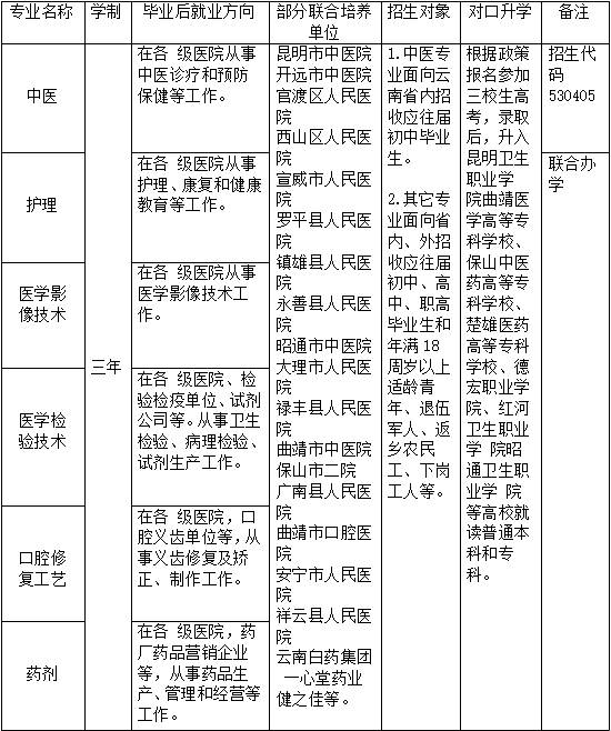 1.填报志愿:按规定在《云南省-毕业升学志愿表》五年制和中职批次,较好志愿分别填报昆明卫 生职业学校(五年制代码:530726,普通中专代码:530405)。